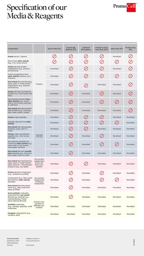 • It is essential for researchers to have a clear understanding of the specifications of our cell culture media and reagents, from serum-free (SF) or xeno-free (XF) to animal component-free (ACF) or chemically defined (CD), to determine which formulation is most appropriate for different applications.