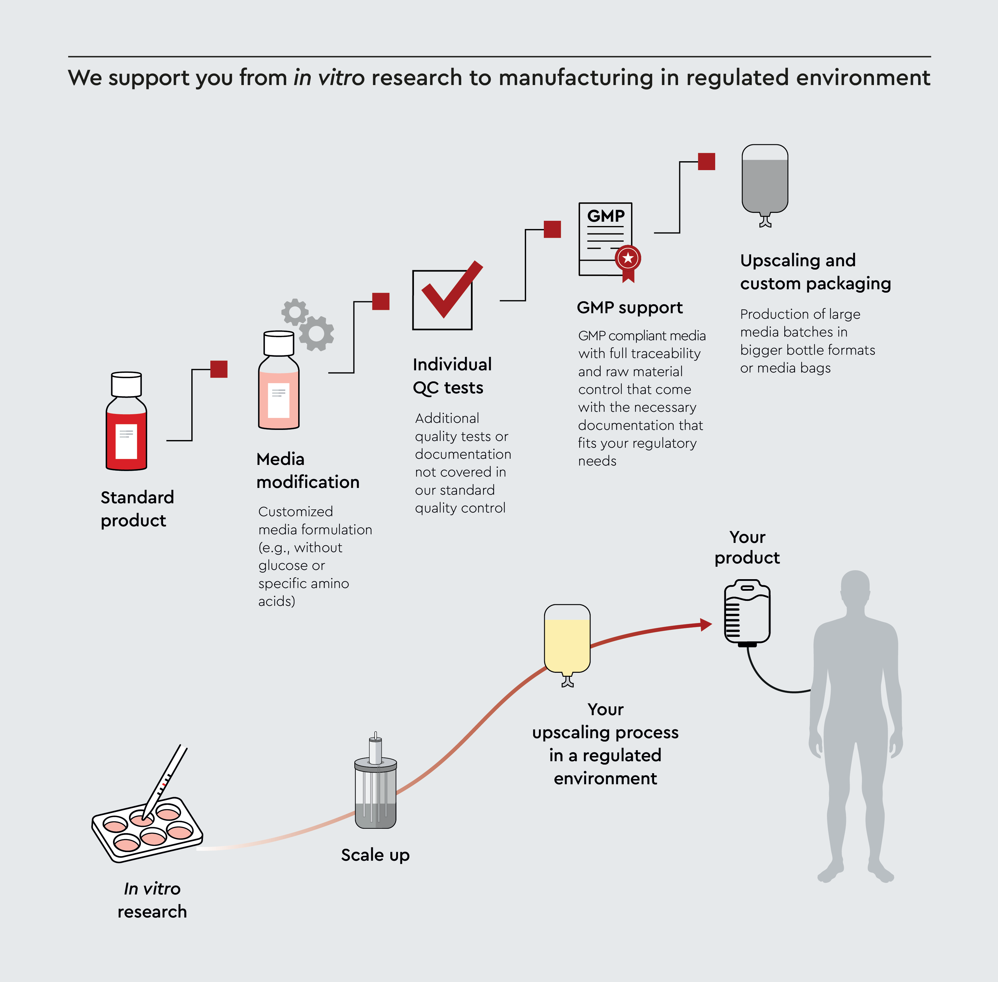 Figure 1: Our customizable media manufacturing process for biopharmaceutical applications. Starting from in vitro research and standard products, our cell culture media can be scaled up and customized through several quality-enhancing stages: media modification with customized formulations, individual QC tests for quality control, comprehensive GMP support with full traceability, and upscaling with custom packaging options.