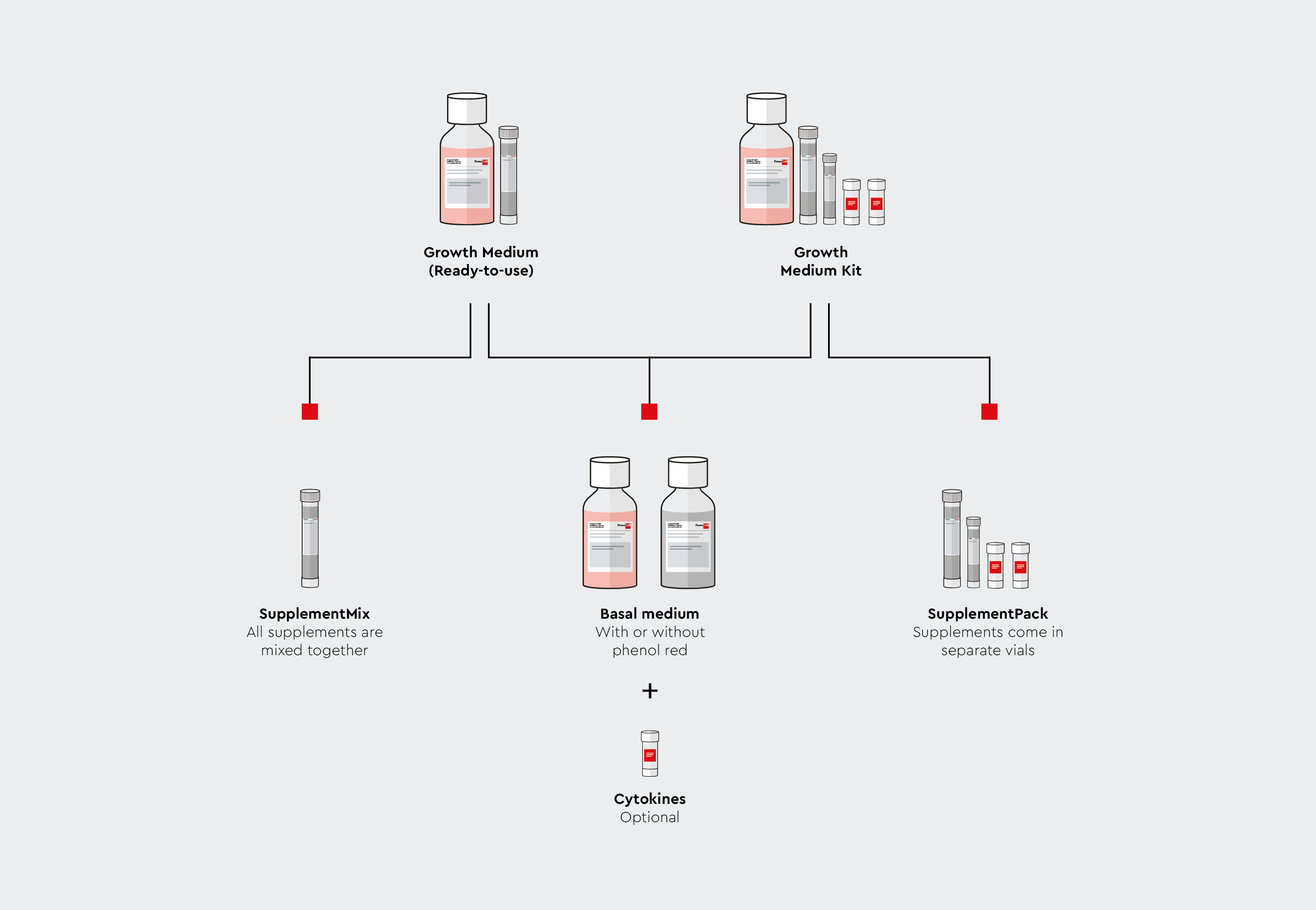• It is also important to understand the specific properties of the media, such as phenol red considerations, intended use guidelines, available media formats (ready-to-use versus kits), and customization options to help you make informed decisions for your research and manufacturing processes.